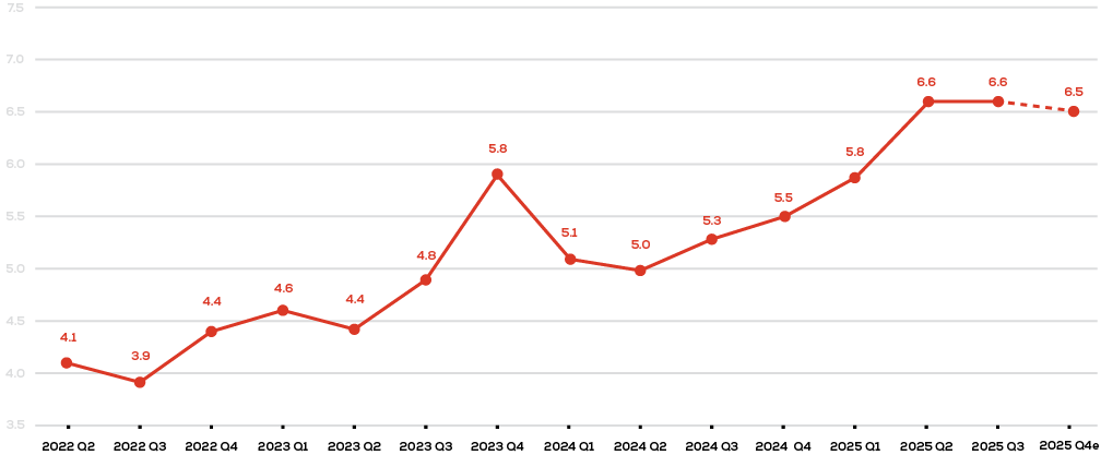 • The overall trend has changed dramatically: The CDS showed a period of stability from 2018 Q1 through 2020 Q1 (9 quarters), yet since 2024 Q2, there has been a huge increase in just five quarters.
